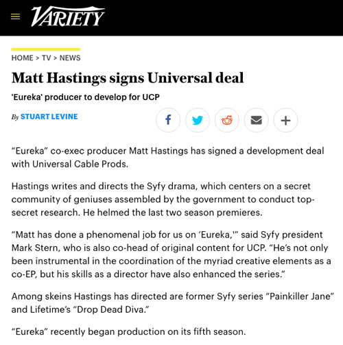 Matt was brought on to reboot and re-imagine SHADOWHUNTERS from the ground up for FreeForm and Netflix. This directly followed a 3 year run on THE ORIGINALS (66 episodes) for the CW as well as 4 seasons of EURKEA and Season 2 of ALPHAS (starring Academy Award Nominee David Strathairn and Mahershala Ali) for SYFY.